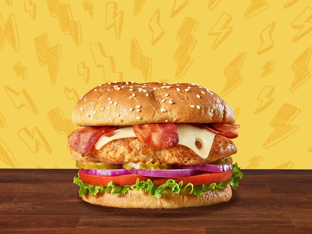 A seasoned grilled chicken breast with White Cheddar cheese, bacon, BBQ sauce, lettuce, tomato, red onions and pickles on a brioche bun.